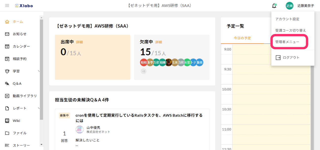画面右上の[アカウント名] > [管理者メニュー]を押すと、コース一覧画面が表示されます。