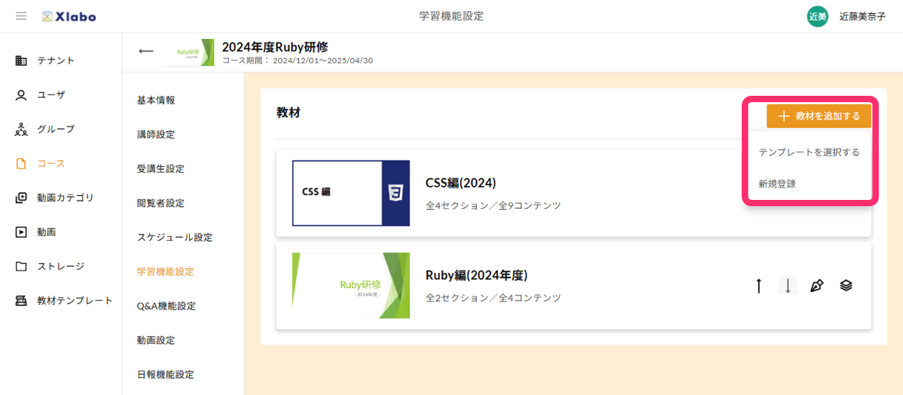 学習機能に追加したい教材テンプレートを選択し、教材を設定します。