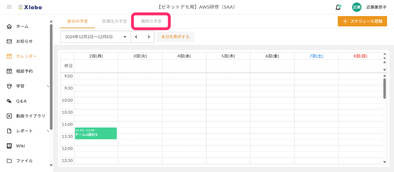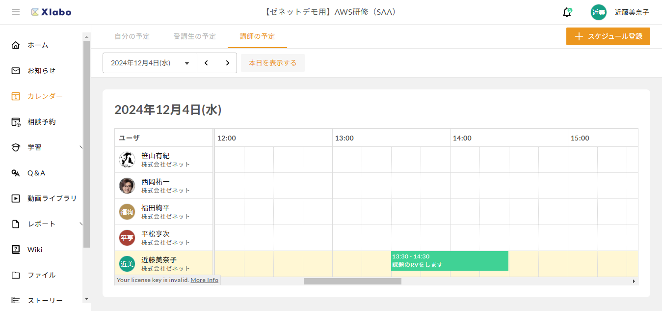受講生の予定画面では、[氏名][グループ]と各受講生が参加する予定が表示されます。